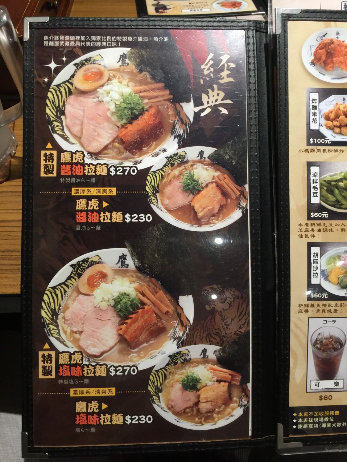 首頁翻開通常都是介紹當店的經典了: 這邊是鷹虎醬油拉麵跟鷹虎鹽味拉麵。我點了特製鷹虎醬油拉麵。