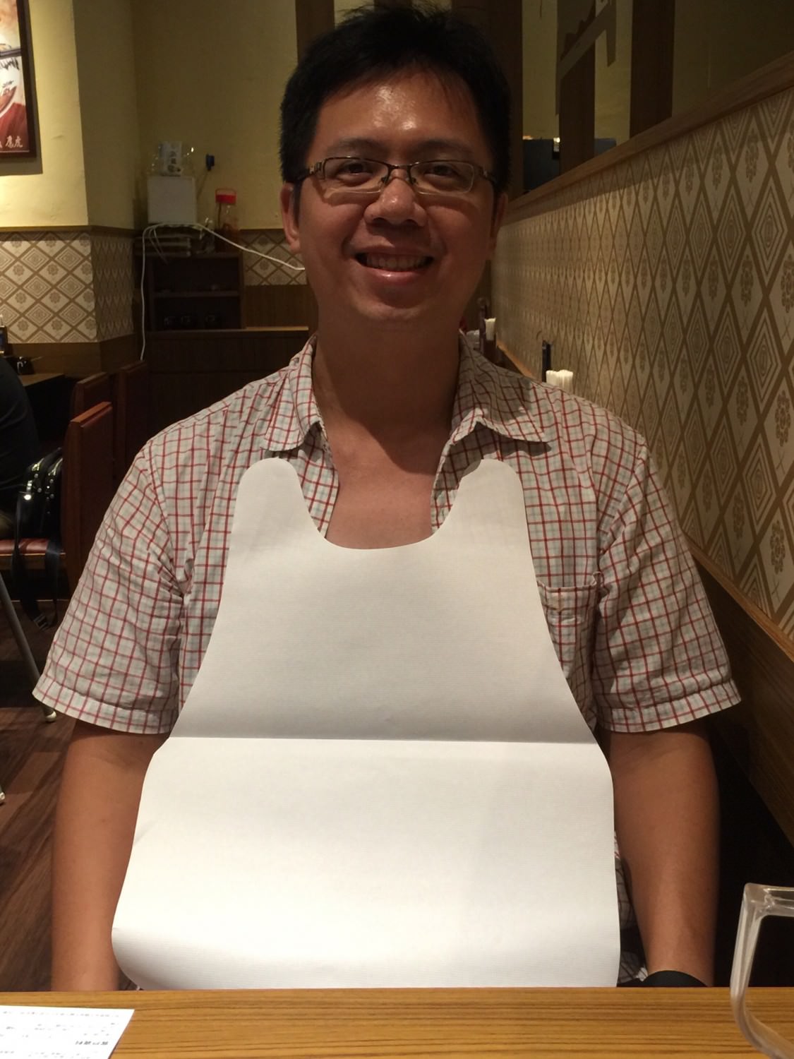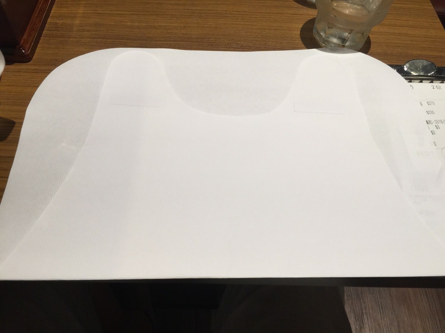 在等待的同時,服務生問我們要不要用紙圍巾.只要可以預防在吃麵的時候身上的衣服被湯濺到.我覺得這個部分日本的拉麵店都做得蠻貼心的,不單單是麵屋武藏-鷹虎,就連後來我們去台南大遠百上新開的山頭火拉麵,也都有提供紙圍巾的服務。