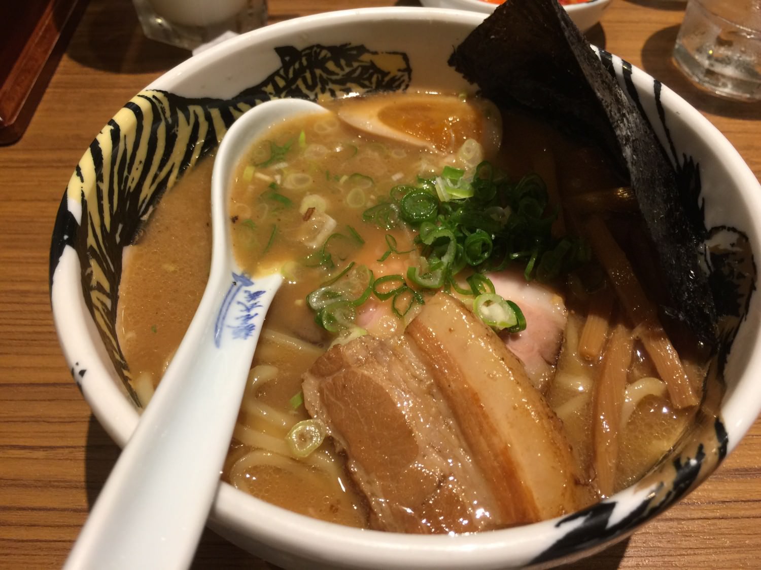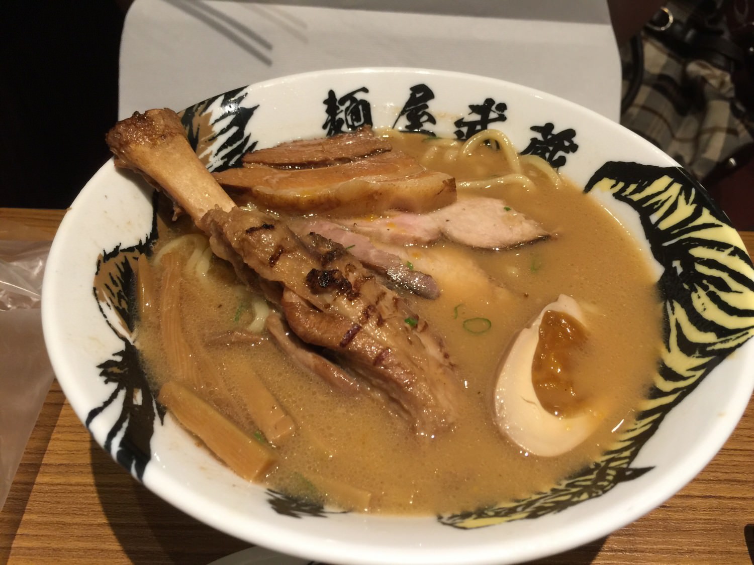 限定是殘酷的。看到這個鷹虎太刀拉麵是每日限量,我的理智線就崩潰了,所以最後我們點了一碗這個。他的太刀指的是那塊豬肋排,長的很像太刀而得名。聽說台中夜市也有所謂的戰車拉麵、軍艦拉麵,也是因為豬排的形狀得名,整個豬排比碗還大的那種暴力版? 改天來去比較看看。