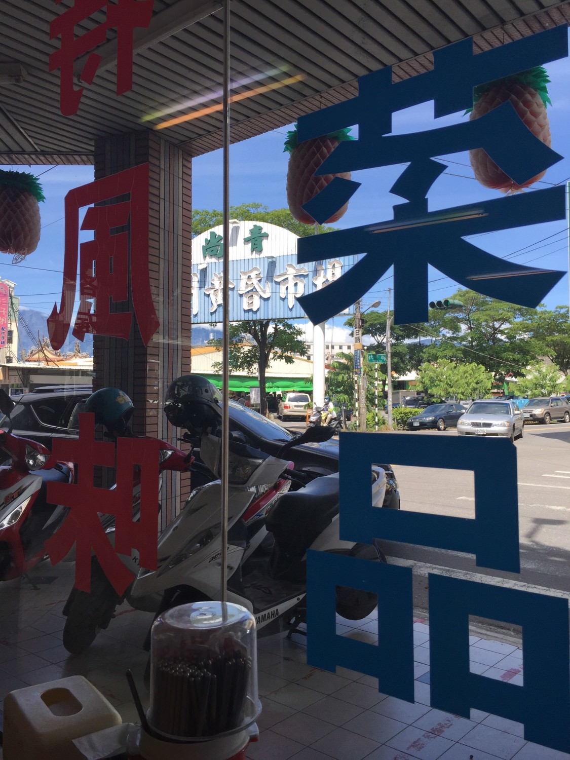 他的招牌從十字口這邊看過去是被遮住的,不過時間餐廳在四周圍顯得非常的突出,應該是有改建過。餐廳相對於十字路口的斜對面就是當地的果菜市場了,所以應該是不難找。