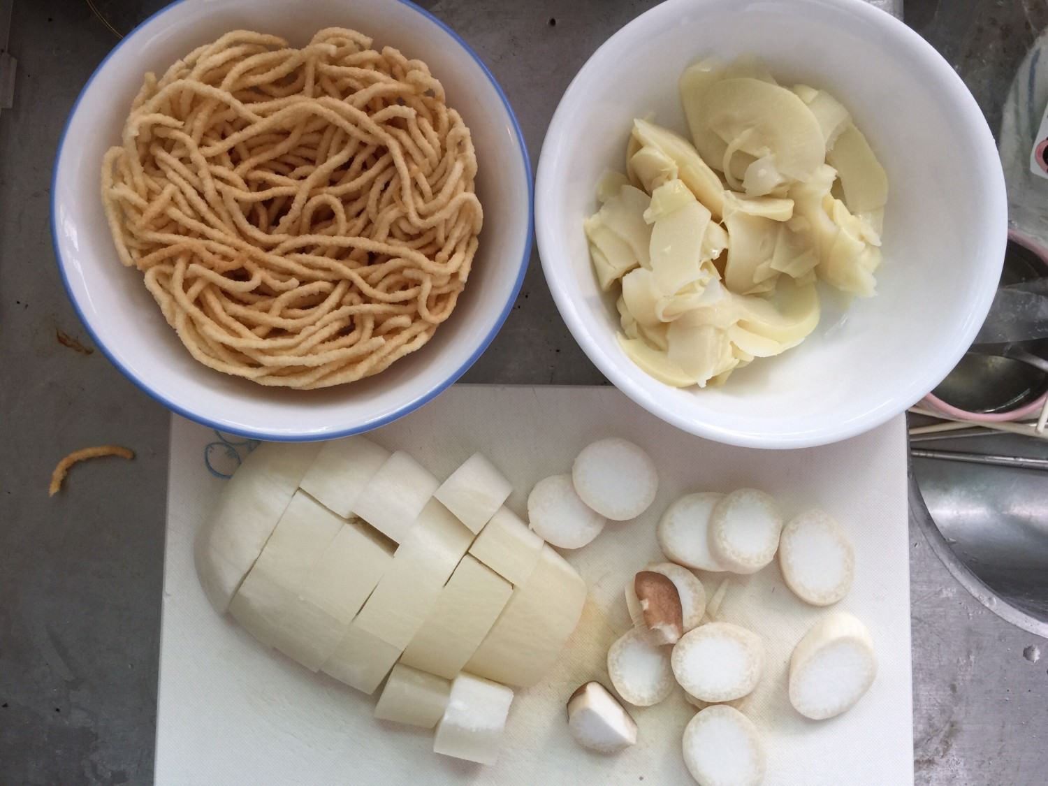 當然為了要準備我今天這一頓小昭版蔥媽媽四物鍋燒意麵,我準備了不少的好料.左上角是裕誠的鍋燒意麵、右上角是南投的脆筍、還有杏鮑菇等.