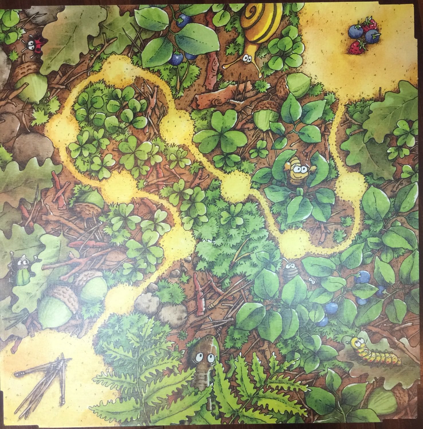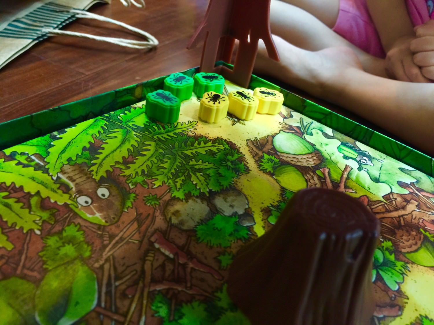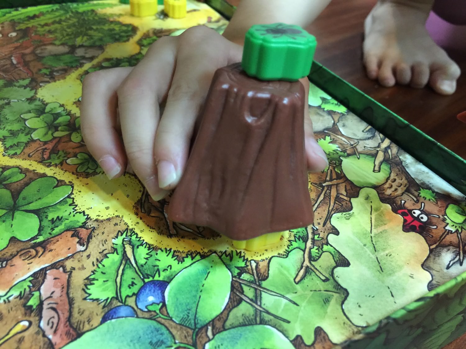 綠色骰子決定這回合移動的是螞蟻(螞蟻圖案)、蜘蛛三兄妹(蜘蛛圖案)、或者是樹墩(樹葉圖案)。