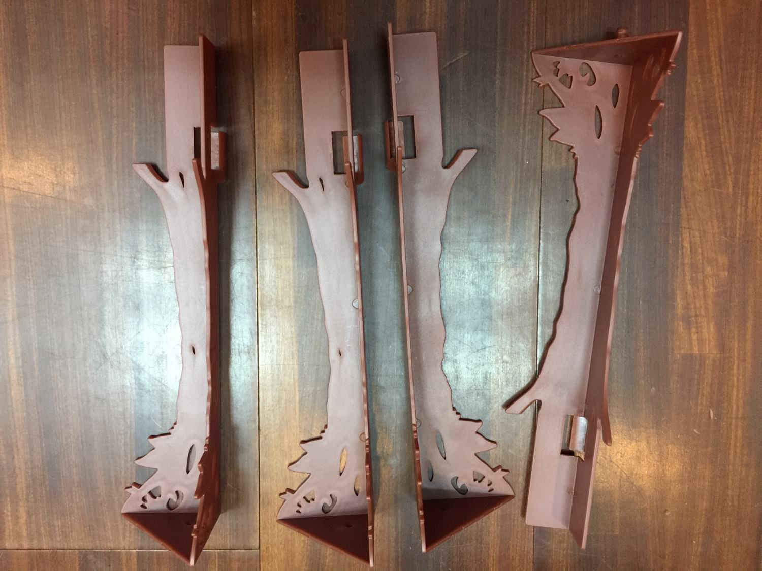 分別把這個四個柱子放在下層圖版的四周圍,在四個角落裡面有預留圓孔,這些柱子就穿過這些圓孔固定在遊戲盒子的底版上面.