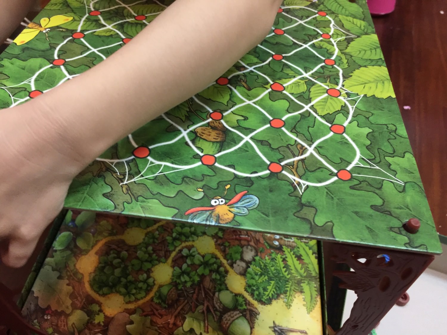配置的時候就是二樓圖板上表面的兩個蜘蛛哥哥,要分別對應二樓圖板下表面的那兩個磁鐵,然後磁吸力把他們吸住,並且固定在圖版上面.這部分也是要小朋友來幫忙.當然也可以在這個時候,跟小朋友說明一下磁鐵的一些原理,是蠻好的教育時刻喔!