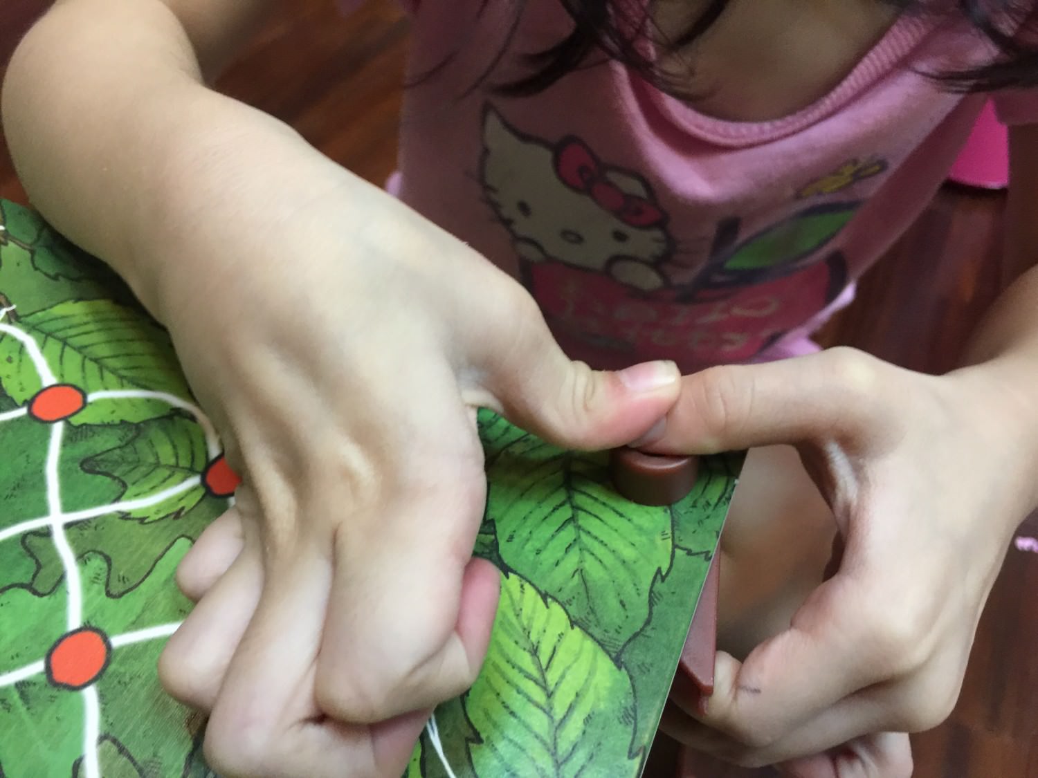 四周圍的洞要稍微對一下,不過不難組裝,父母們可以適時幫忙一下。有看到上面的紅點嗎? 之後蜘蛛就是走在這些紅點上面。