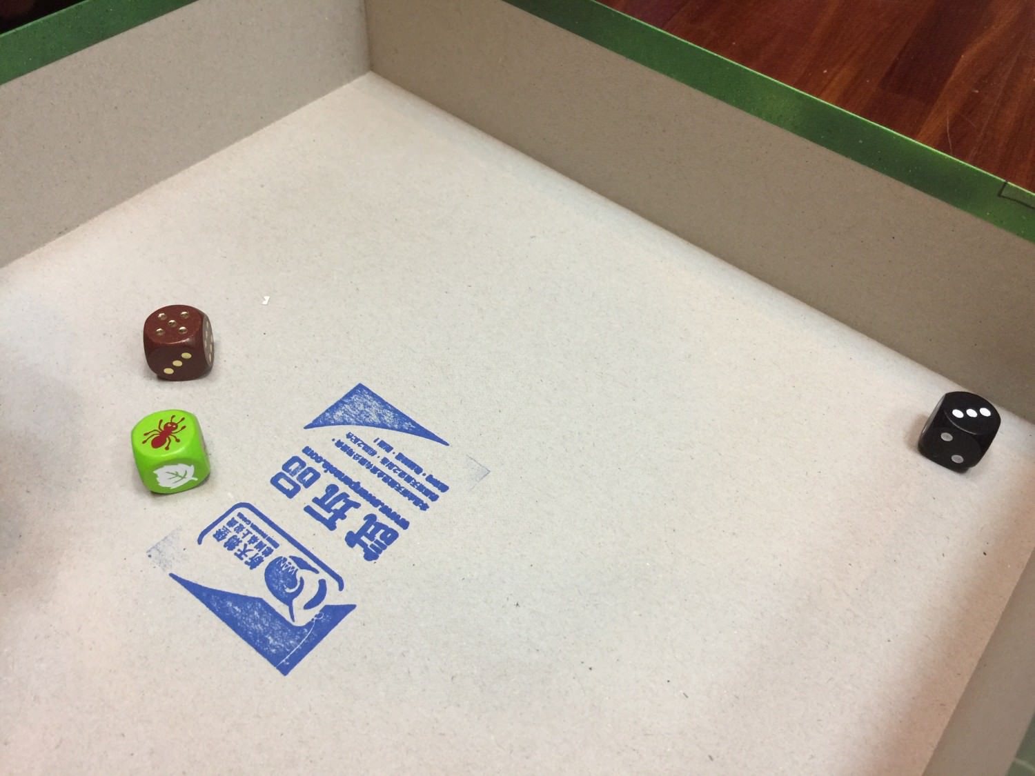 接著,則由玩家輪流擲骰子進行。可以看到下圖中有三顆骰子,分別是綠色、棕色、與黑色: