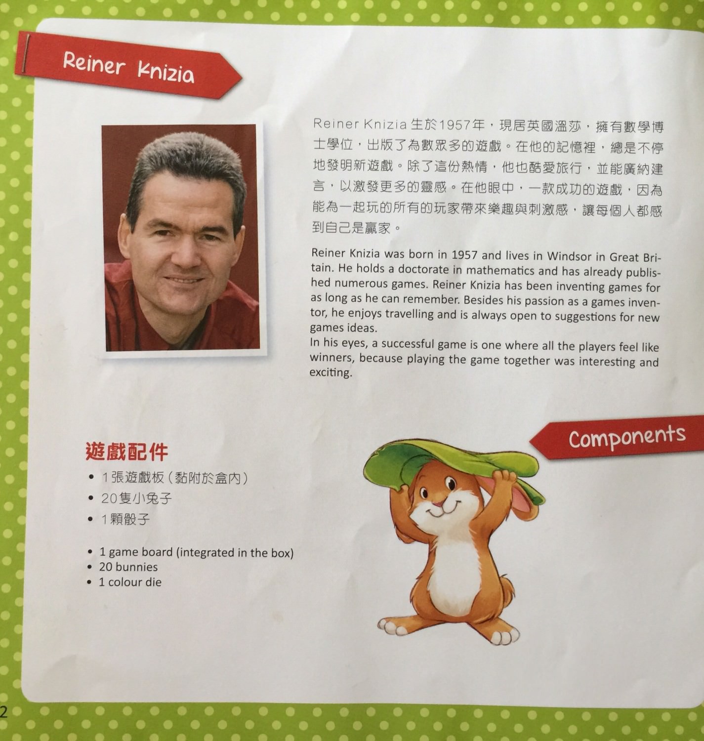 打開說明書,才發現原來作者是鼎鼎大名的 Reiner Knizia 。他得過的獎項無數,曾經創作過的桌遊,包含有 Modern Art 現代藝術Medici 梅地奇…等多達 15 個桌遊,而且在美國 100 大桌上遊戲當中,他本人的遊戲就佔了有 10 個。(待更新) 因此,在還沒有玩這款遊戲之前,心裡就蠻期待的。
