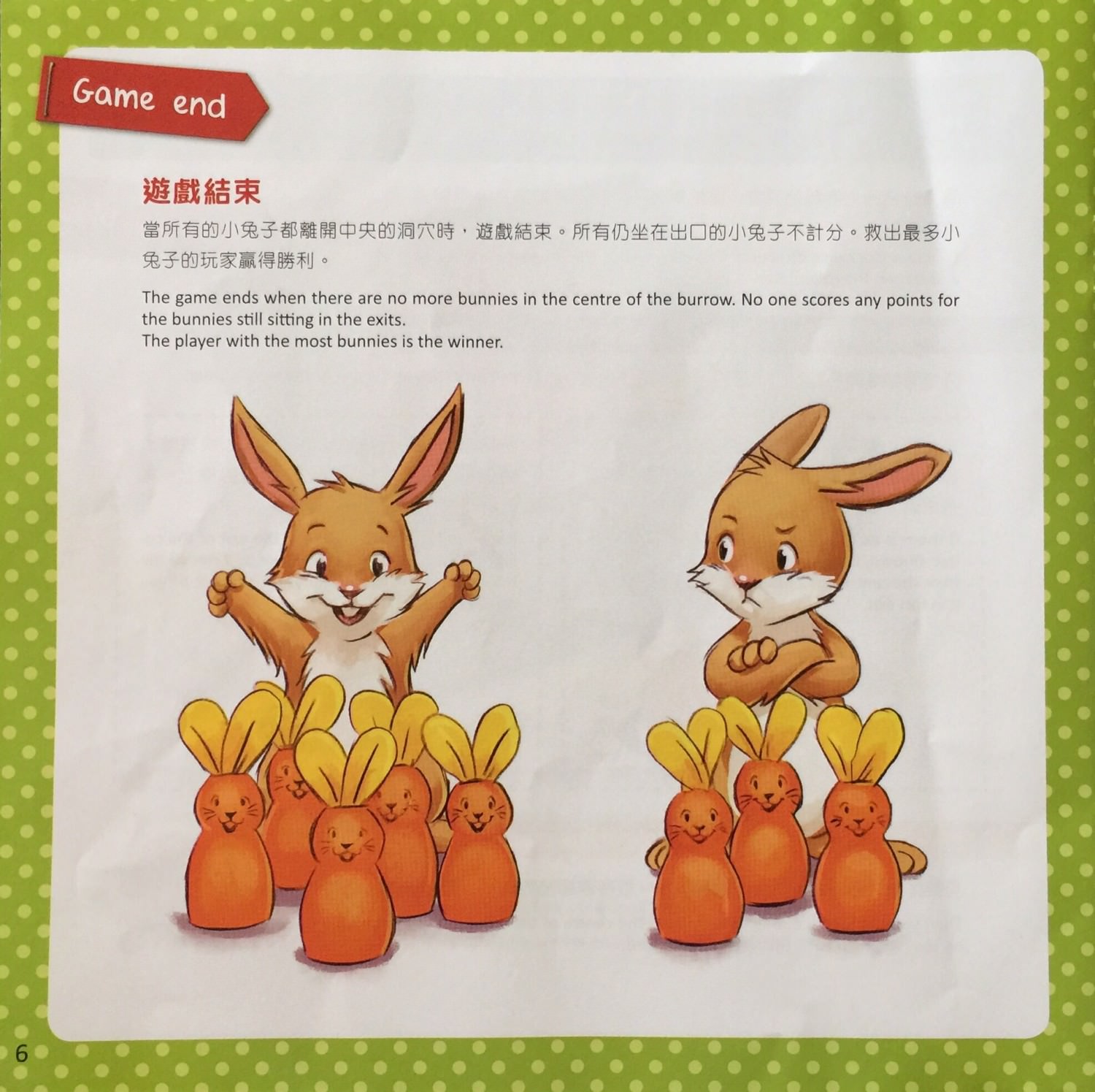 把所有的兔子都都離開中央的兔子大洞穴的話,遊戲就立刻結束,計算手上有最多兔子的玩家獲得遊戲的勝利。[/alert_note]
