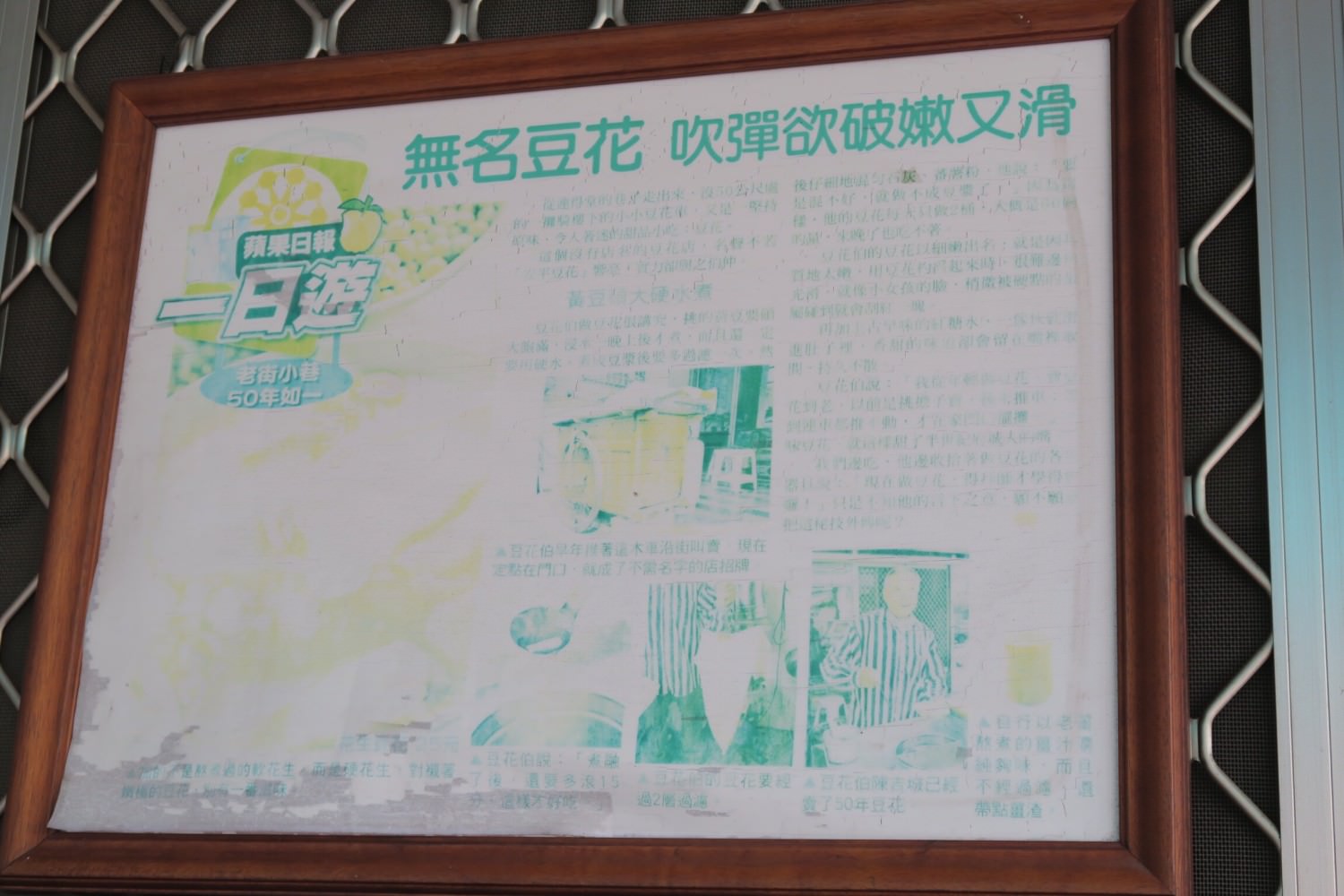 在亭仔腳的這家無名豆花店,門口還掛著老爺爺當年賣豆花的身影,這樣傳承下來,已經是七十年囉!