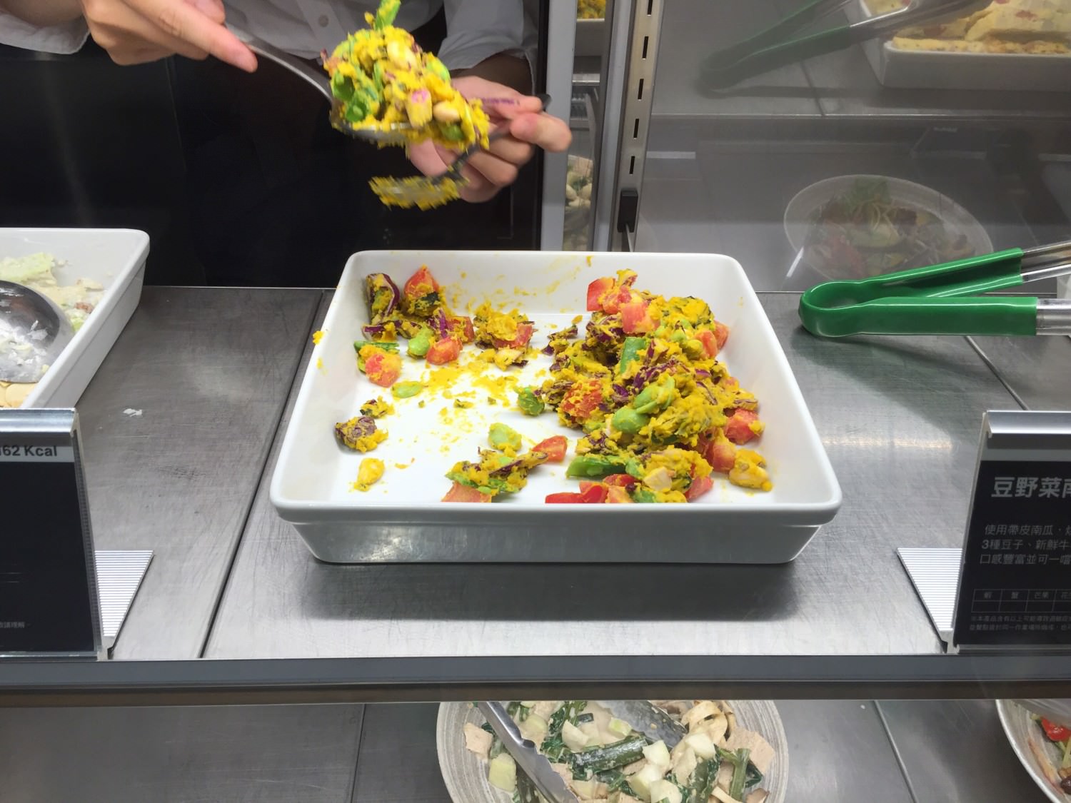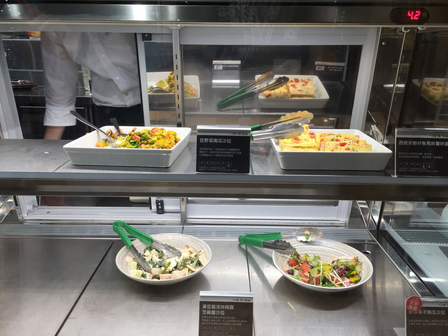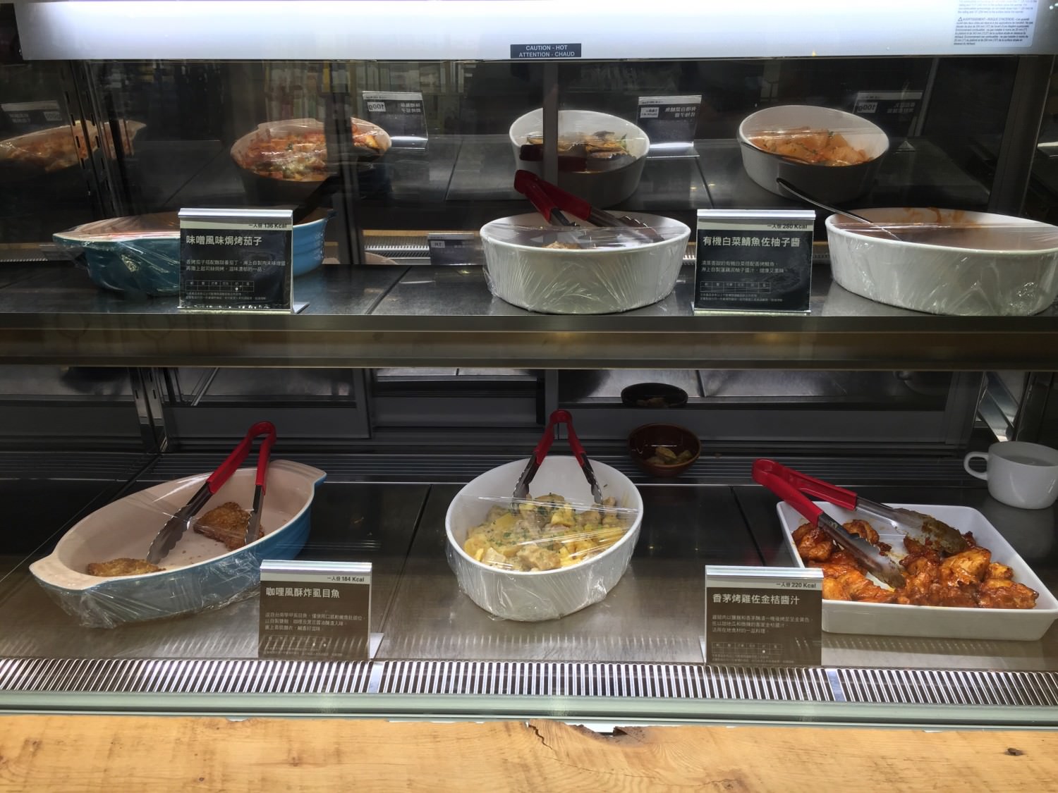 來看看有什麼食物吧!餐櫃上面的指示一目了然,熱食與冷食分開放,絕對不會搞混,要煩惱的是,東西看起來都好吃,怎麼選擇呢?